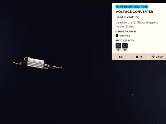 A Voltage Converter sells for 500 Coins, but their real value lies in their utility or the materials they can be extracted from. You can also obtain Voltage Converters by recycling the following high-tier items: