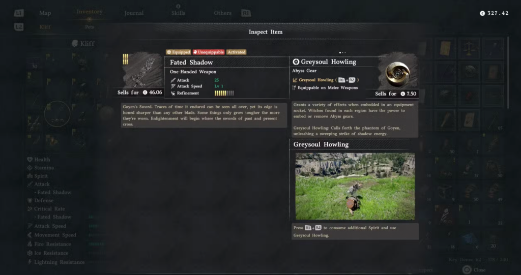 • Greysoul Howling: This unique skill allows you to summon the phantom of Goyen. When activated, the phantom unleashes a devastating shadow energy strike that adds extra hits and massive range to your standard Turning Slash.