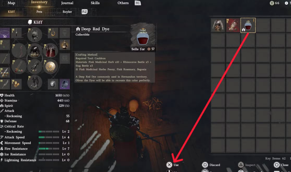 - Learn the Recipe: Open your inventory, highlight the Deep Red Dye, and select “Use” (X on Xbox / A on PlayStation). This adds the color to your permanent library.