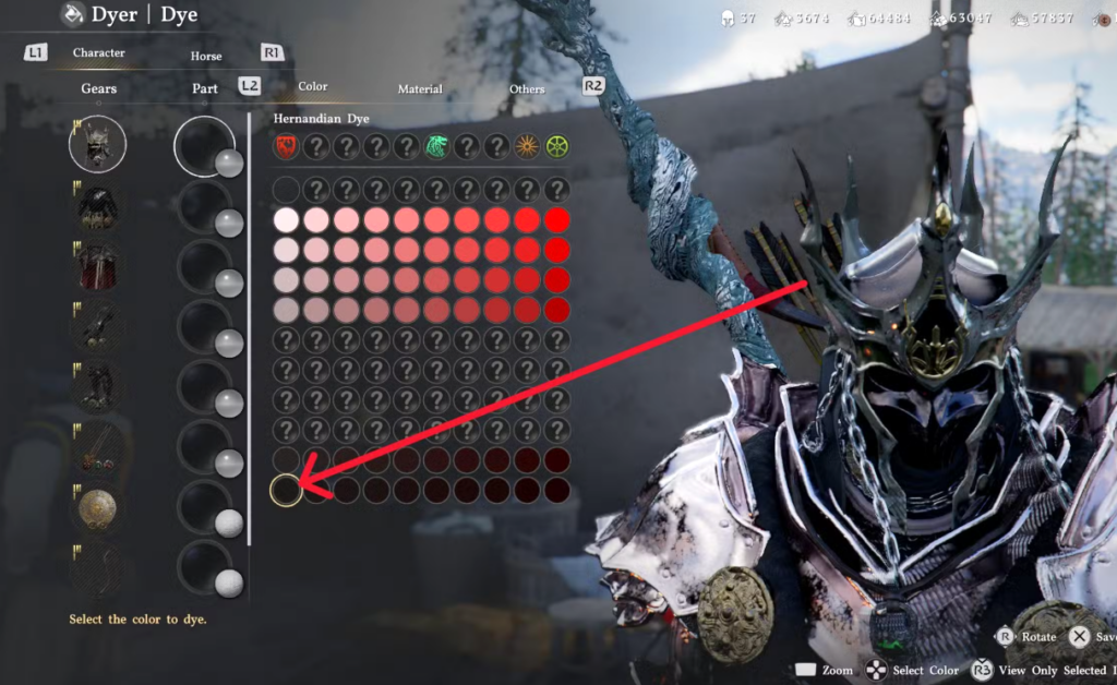 - Apply the Color: In the dye menu, look at the bottom-left section of the Hernandian Dyes category. You will see the deep, charcoal-black option available.