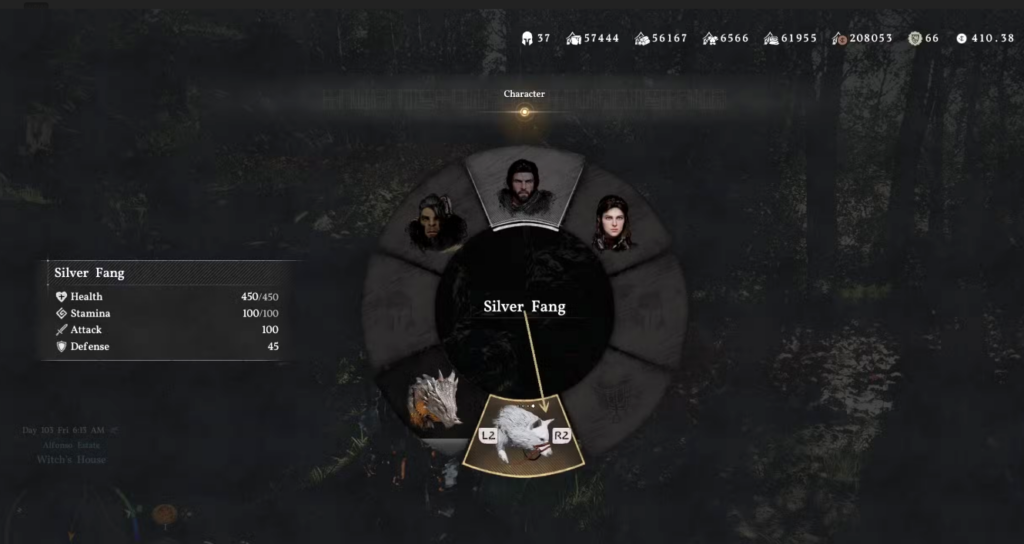 A: Compared to other mounts (especially horses), Silver Fang is relatively slow and has a low pool of health and stamina. Think of him as a combat companion rather than a long-distance sprinter.
