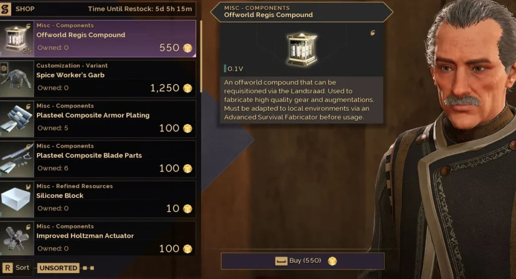 - You buy Offworld Regis Compounds with House Scrip from Landsraad Missions