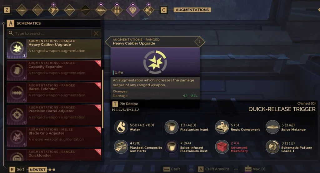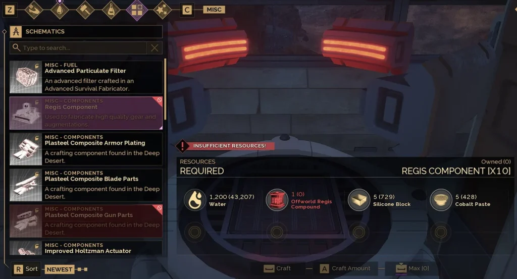 Output note: Each craft yields 10 Regis Components, which is why buying Offworld Regis Compound tends to become your repeatable “Augment fuel” loop.