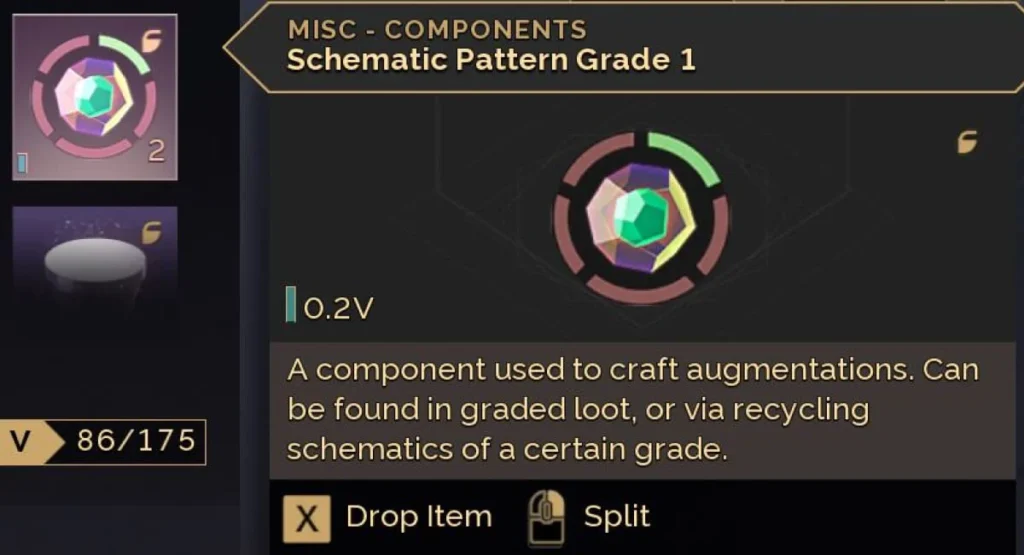 Schematic Patterns are used specifically for crafting Augmentations and drop from Challenge Mode Testing Stations.