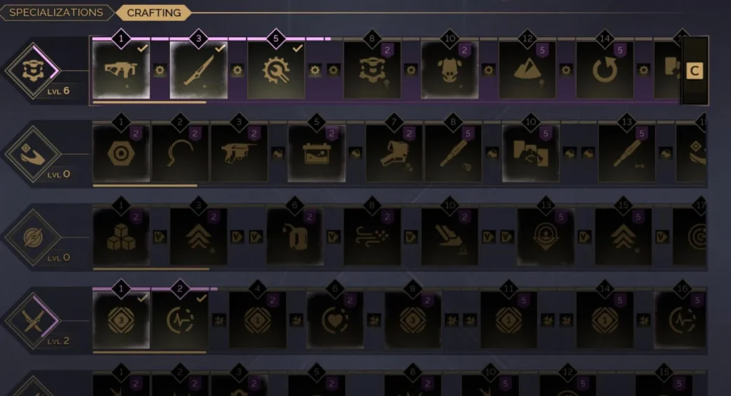 - Crafting to early augment unlock milestone