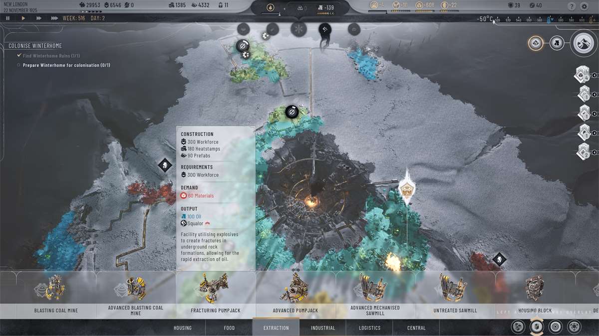 Kromě politických intrik a manévrování se budete muset postarat i o samotné přežití a fungování vašeho města. Je nezbytné těžit suroviny, zajistit dostatek potravin, starat se o zdraví obyvatel a udržovat teplo i během nejkrutějších zim. Občané potřebují nejen místo k odpočinku, ale také prostory, kde mohou relaxovat a zbavit se stresu. Jak postupujete hrou, budete odemykat stále více budov, které vám pomohou rozšířit vaše město a zlepšit jeho životaschopnost. V pozdějších fázích hry nabídne Frostpunk 2 opravdu širokou škálu staveb, které vám umožní lépe spravovat vaše rozrůstající se společenství.