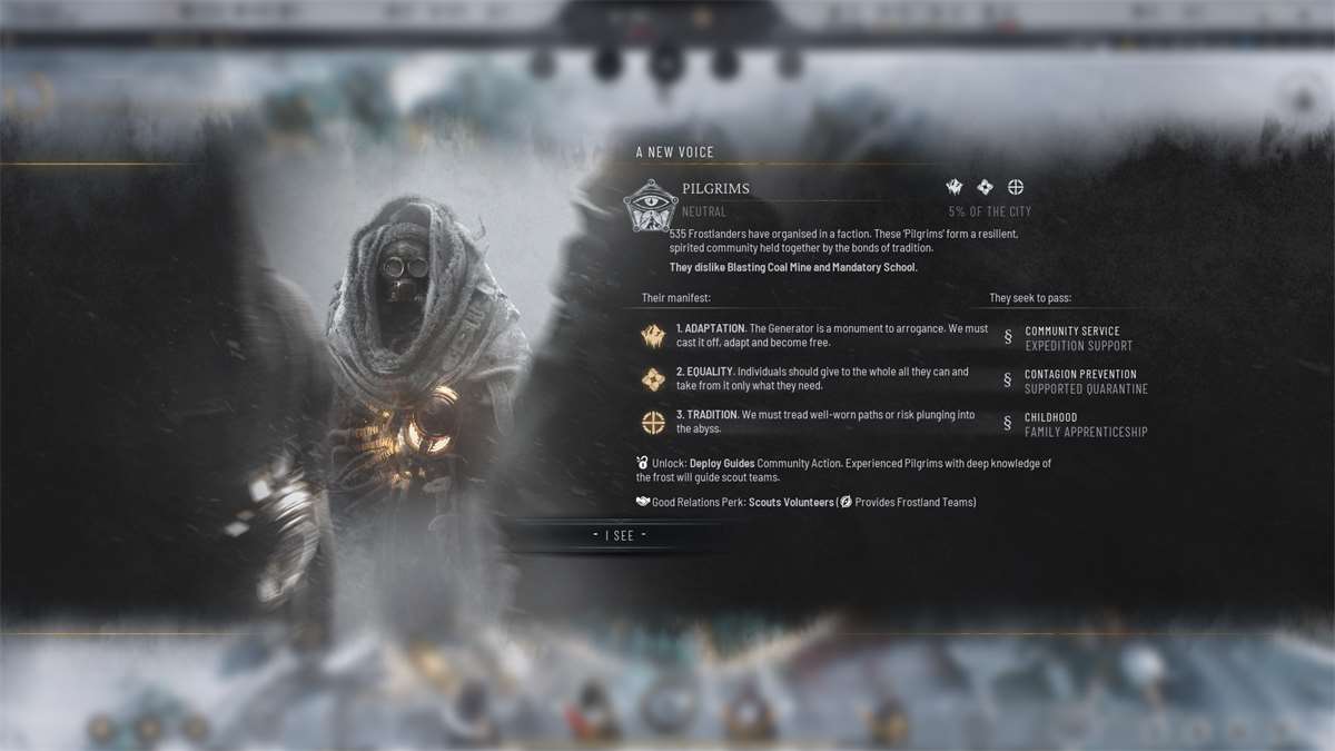 V pokračování Frostpunku už nejde lidem pouze o přežití jako v prvním díle. Jakmile se základní potřeby uspokojí, objevují se nové výzvy. Kam se bude vývoj společnosti ubírat? Jaké hodnoty, principy či božstva budou hráči následovat? A jaký životní standard poskytnete svým občanům?